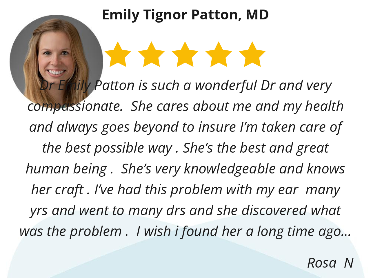 Dr Emily Patton is such a wonderful Dr and very compassionate. She cares about me and my health and always goes beyond to insure I’m taken care of the best possible way . She’s the best and great human being . She’s very knowledgeable and knows her craft . I’ve had this problem with my ear many yrs and went to many drs and she discovered what was the problem . I wish i found her a long time ago but now she’s addressing the issue and i finally got some relief and good she found it before it could become critical . I really appreciate her very much .
