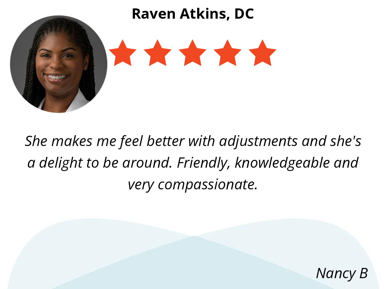 She makes me feel better with adjustments and she's a delight to be around. Friendly, knowledgeable and very compassionate.