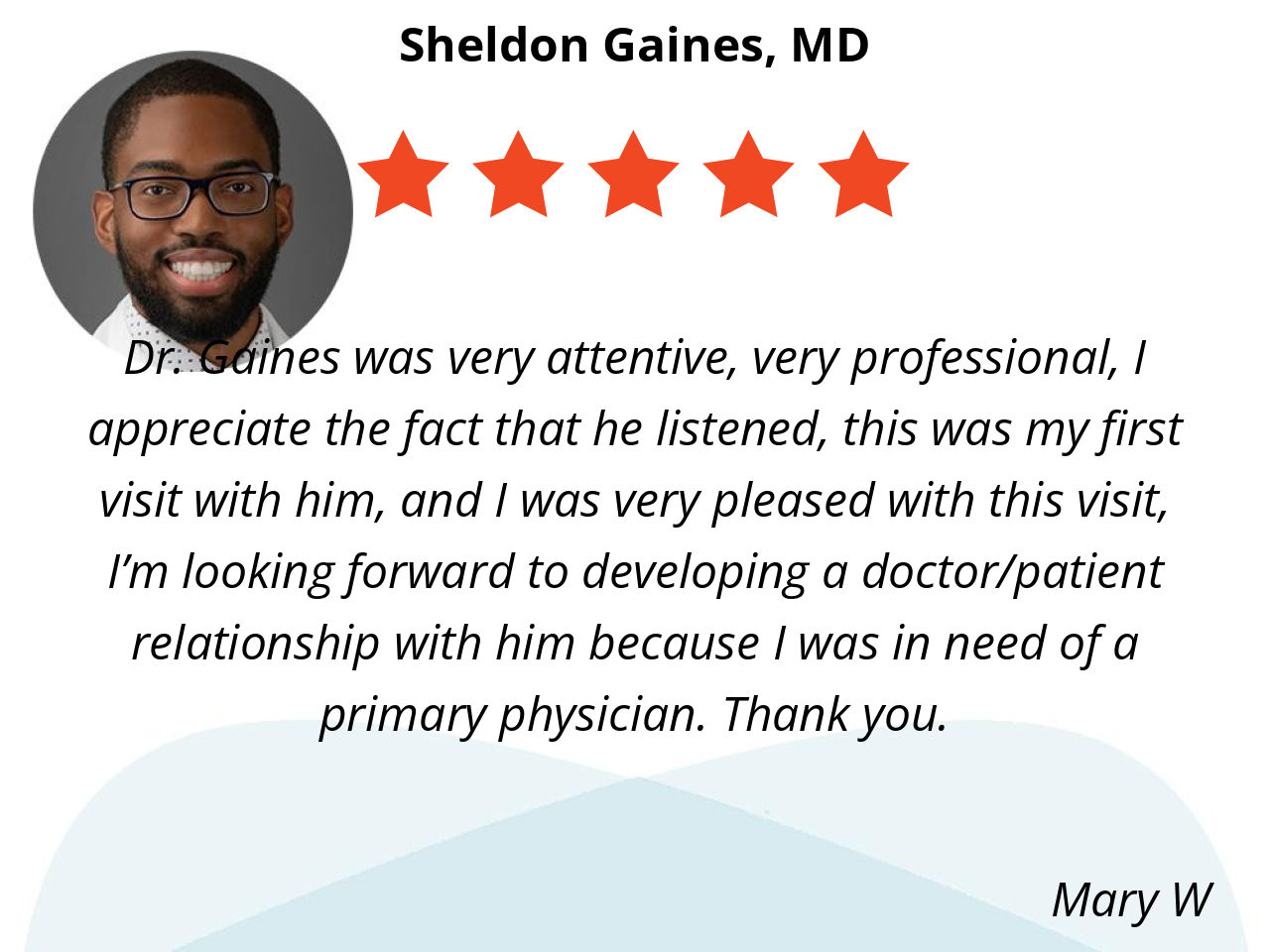 Dr. Gaines was very attentive, very professional, I appreciate the fact that he listened, this was my first visit with him, and I was very pleased with this visit, I’m looking forward to developing a doctor/patient relationship with him because I was in need of a primary physician. Thank you.