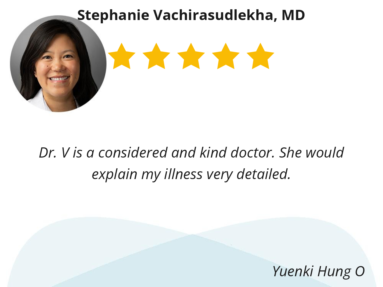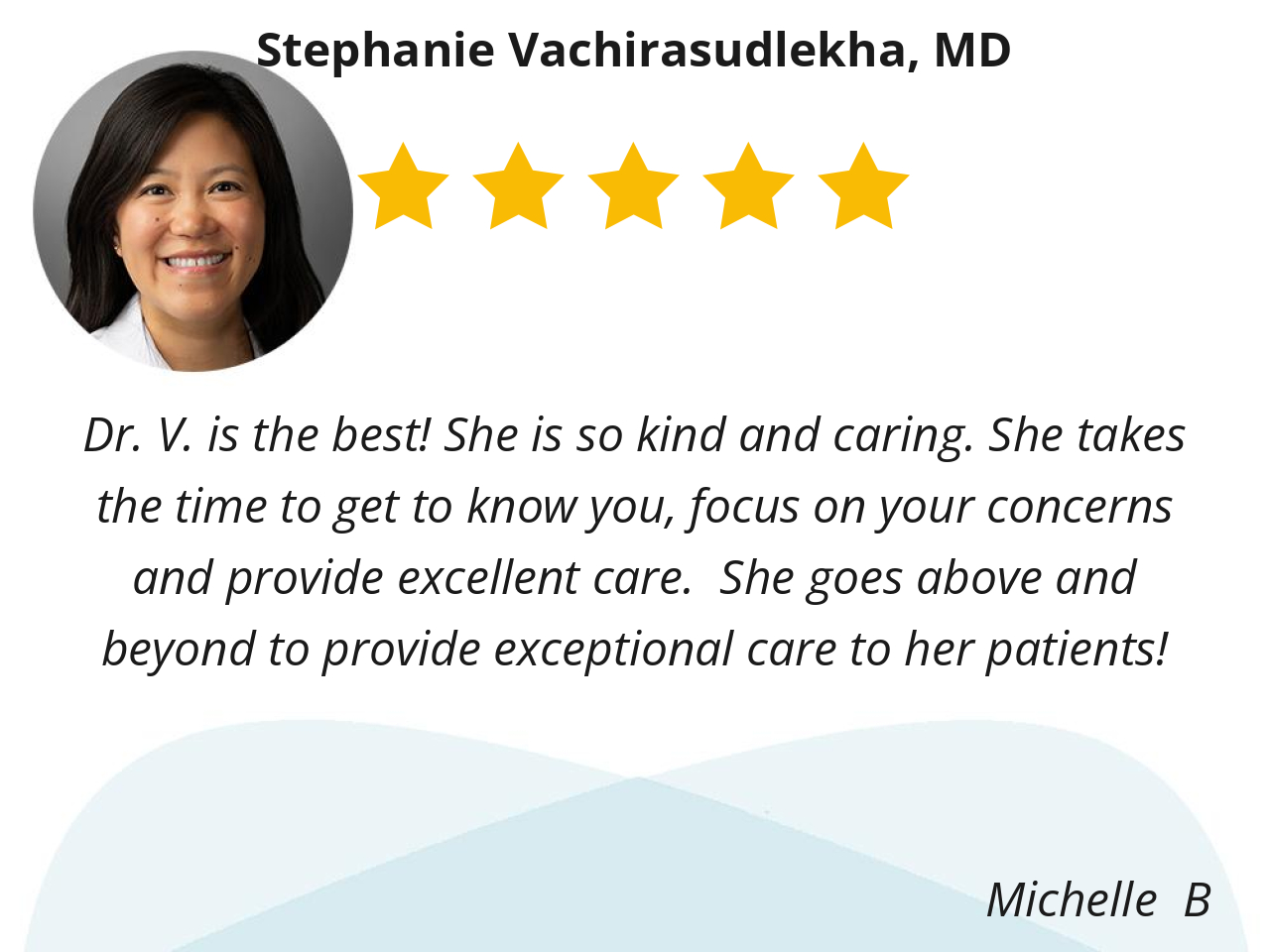 Dr. Stephanie Vachirasudlecka (or Dr. V) is an amazing Primary Care Physician. She is so kind, caring, knowledgeable and takes her time to explain everything to you in detail. She is never rushed and truly cares about her patients. I could not say enough kind things about her. Her staff is very kind and caring as well.