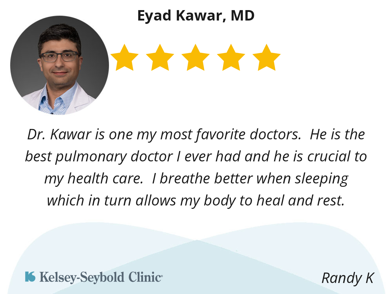 Dr. Kawar is one my most favorite doctors. He is the best pulmonary doctor I ever had and he is crucial to my health care. I breathe better when sleeping which in turn allows my body to heal and rest.