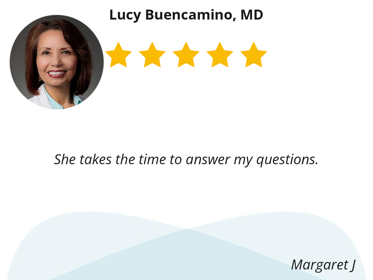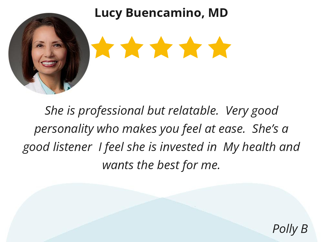 She is always patient with me. Answering my questions and concerns. She always has the right words to put me at ease and understand my health concerns. I have had her for doctor for a number of years, she is an important part of my life. I admire her and trust her. Thank you Dr. Buencamino for being you.