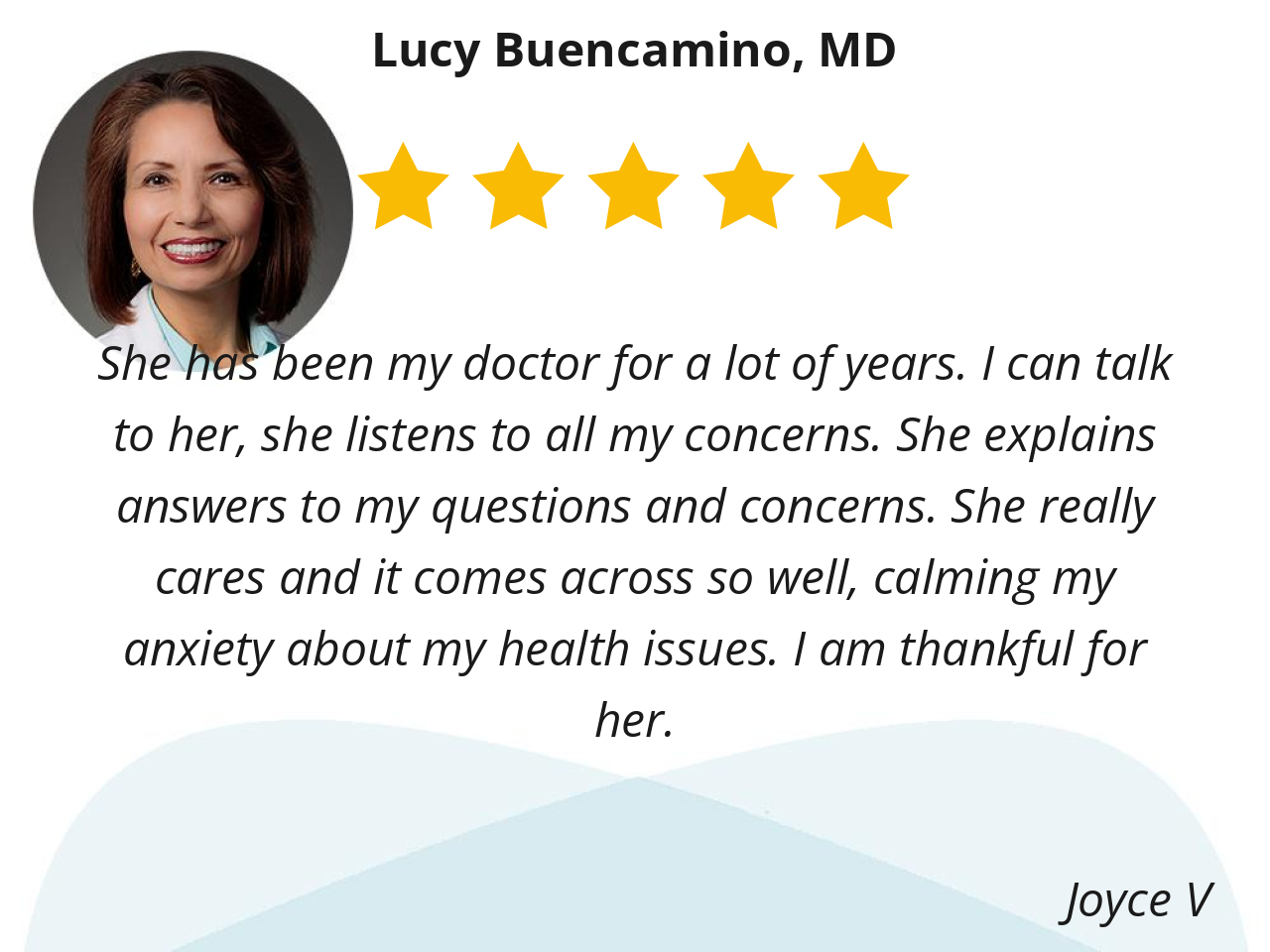 I like that Dr. Buencamino always listens carefully, takes her time, and never leaves me feeling rushed. She addresses my concerns and emphasizes prevention and healthy lifestyle adjustments before resorting to medication, which I appreciate. I trust her which is why I continue to see her.
