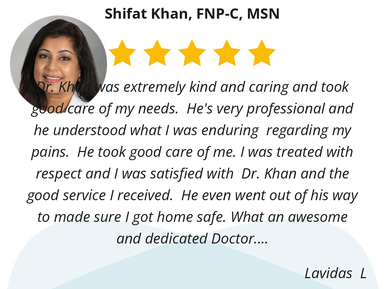 Dr. Khan was extremely kind and caring and took good care of my needs. He's very professional and he understood what I was enduring regarding my pains. He took good care of me. I was treated with respect and I was satisfied with Dr. Khan and the good service I received. He even went out of his way to made sure I got home safe. What an awesome and dedicated Doctor.