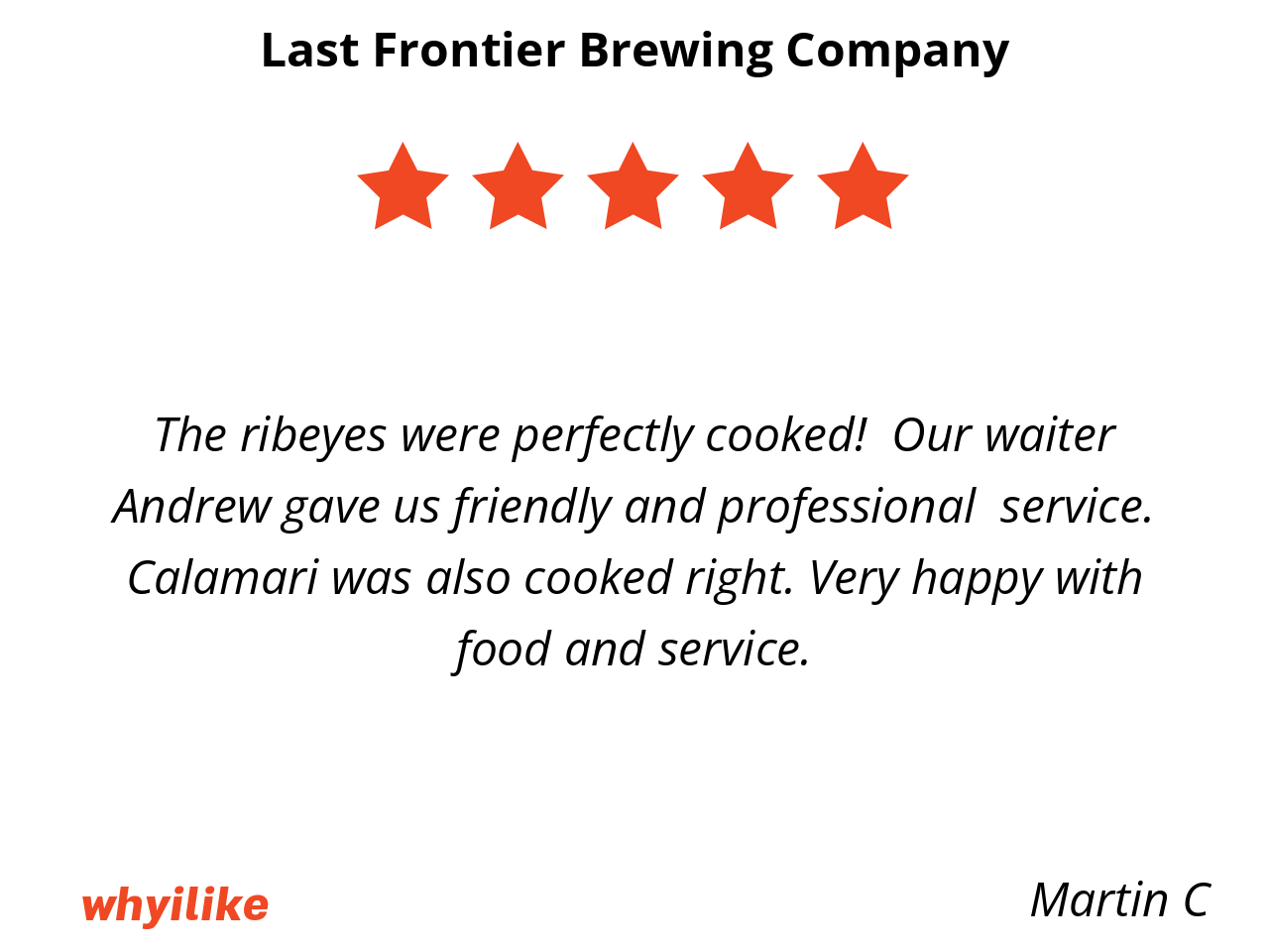 The Last Frontier Brewery is a family run business, by Alaskans for Alaskans and visitors to Alaska. We strive for excellence and quality in everything we do, and we offer a dining experience that is unique and memorable. We make all of our own soups, sauces, and dressings. We serve fresh burgers from locally produced beef and our seafood is off-the-charts good. Our steaks and prime rib are Choice grade.