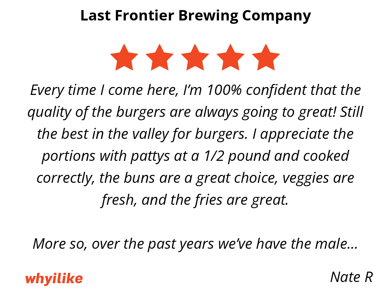 The Last Frontier Brewery is a family run business, by Alaskans for Alaskans and visitors to Alaska. We strive for excellence and quality in everything we do, and we offer a dining experience that is unique and memorable. We make all of our own soups, sauces, and dressings. We serve fresh burgers from locally produced beef and our seafood is off-the-charts good. Our steaks and prime rib are Choice grade.