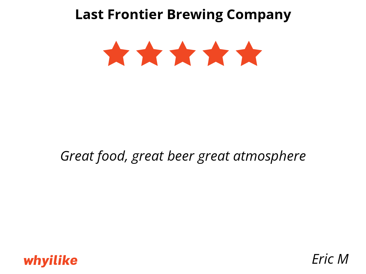 The Last Frontier Brewery is a family run business, by Alaskans for Alaskans and visitors to Alaska. We strive for excellence and quality in everything we do, and we offer a dining experience that is unique and memorable. We make all of our own soups, sauces, and dressings. We serve fresh burgers from locally produced beef and our seafood is off-the-charts good. Our steaks and prime rib are Choice grade.