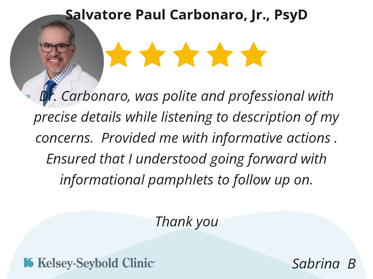 Dr. Carbonaro, was polite and professional with precise details while listening to description of my concerns. Provided me with informative actions . Ensured that I understood going forward with informational pamphlets to follow up on.