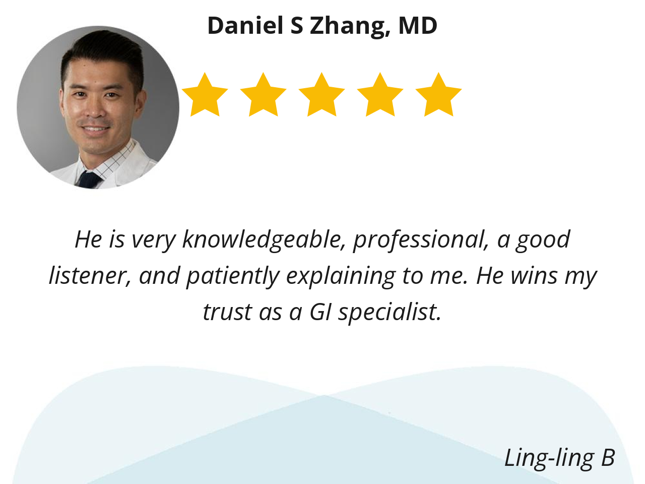 He is very knowledgeable, professional, a good listener, and patiently explaining to me. He wins my trust as a GI specialist.
