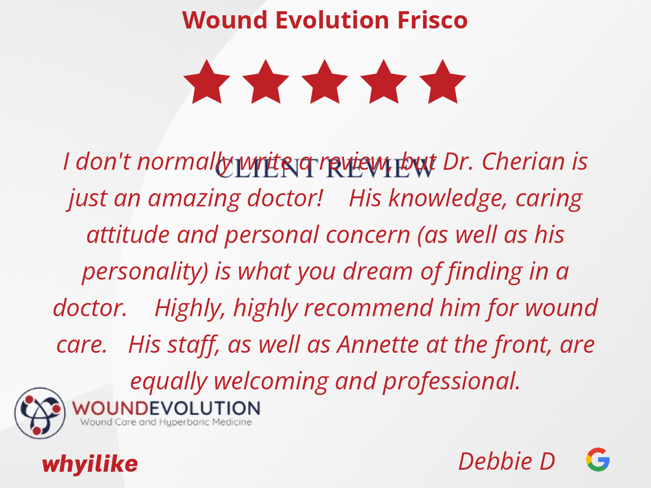 I don't normally write a review, but Dr. Cherian is just an amazing doctor! His knowledge, caring attitude and personal concern (as well as his personality) is what you dream of finding in a doctor. Highly, highly recommend him for wound care. His staff, as well as Annette at the front, are equally welcoming and professional.