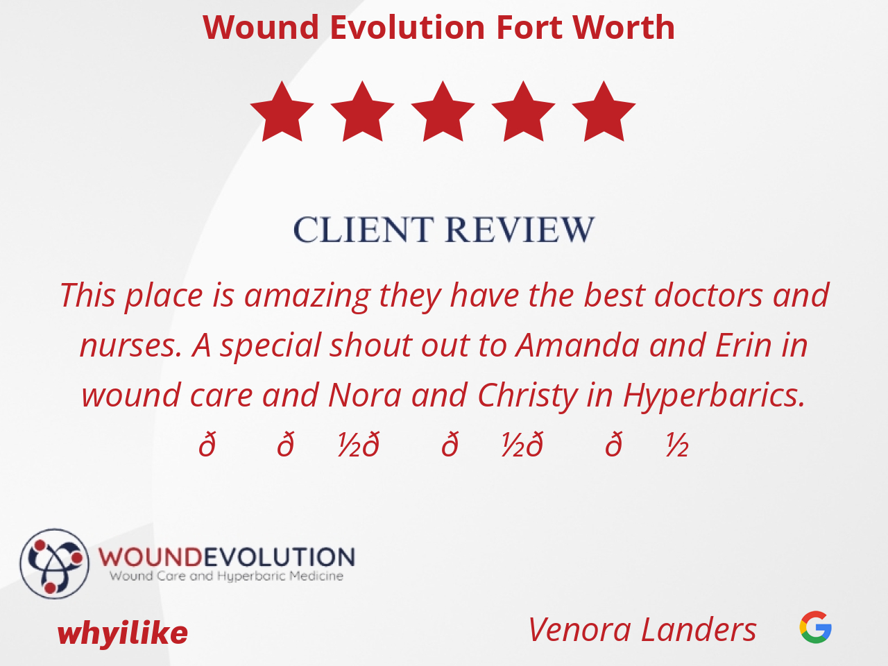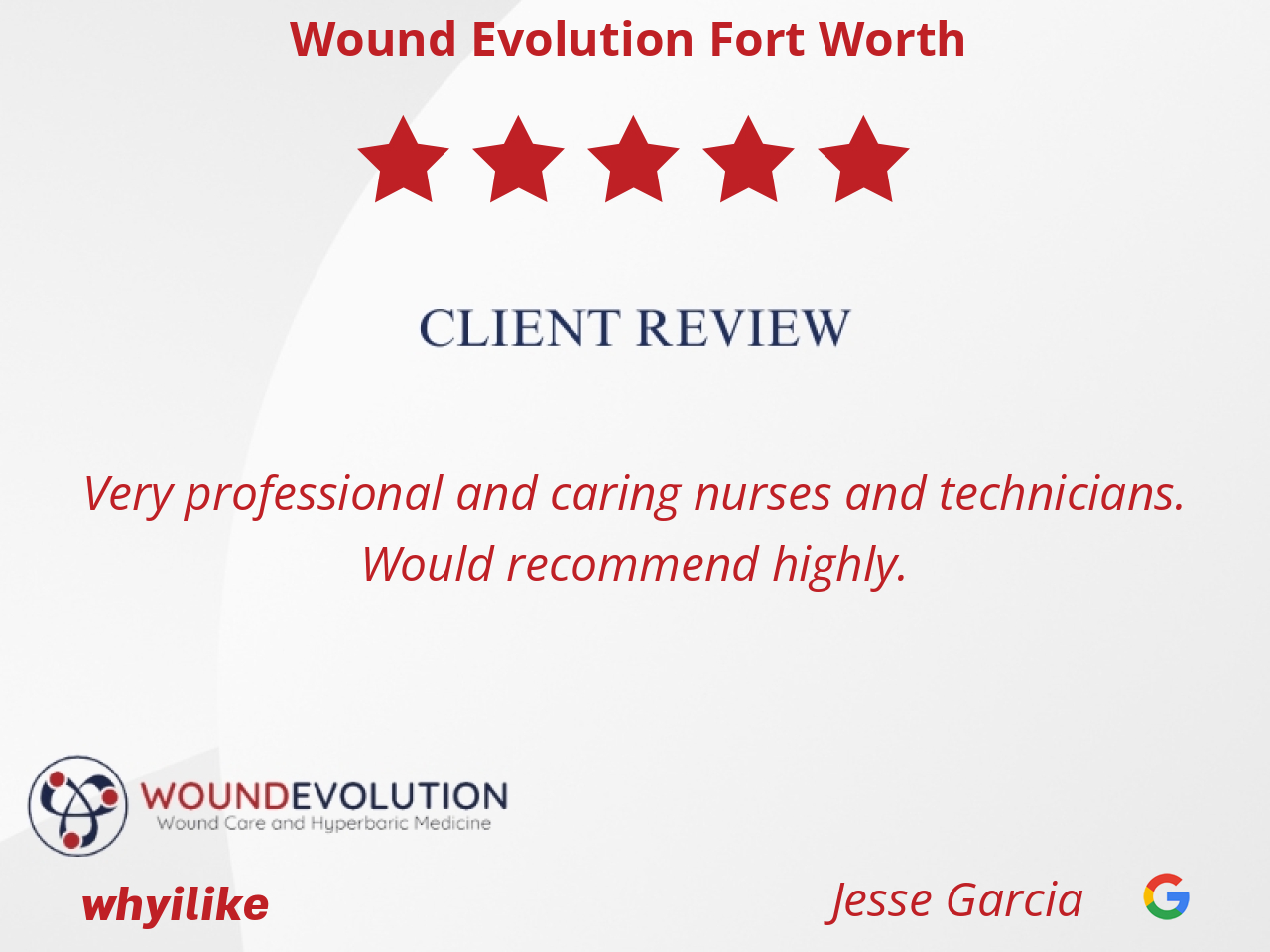 The doctors and staff are knowledgeable, kind and caring at Wound Evolution in Fort Worth. I’m confident in the excellent, professional care I’m receiving and highly recommend their services.