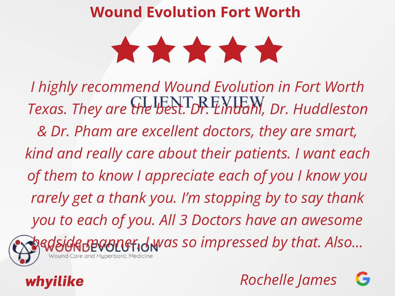 I highly recommend Wound Evolution in Fort Worth Texas. They are the best. Dr. Lindahl, Dr. Huddleston & Dr. Pham are excellent doctors, they are smart, kind and really care about their patients. I want each of them to know I appreciate each of you I know you rarely get a thank you. I’m stopping by to say thank you to each of you. All 3 Doctors have an awesome bedside manner, I was so impressed by that. Also Doctor Pham gives the best hugs especially on a day I needed it the most. I received excellent care from each of them. Their front desk staff are the most sweetest ladies especially Jaelyn. The nurses were so kind and sweet too especially Amanda, who cared for me and made sure I had everything I needed so I could heal and I thank you for the hug too. I want you ladies to know you touched my life that I can see the love and care for humanity still exist in this world you all exemplify that.