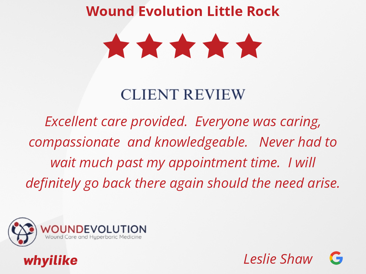 I like everything about Wound Evolution. The staff is professional and courteous . They send appointment reminders and updates. They genuinely care about patients and that is an A+ for me!