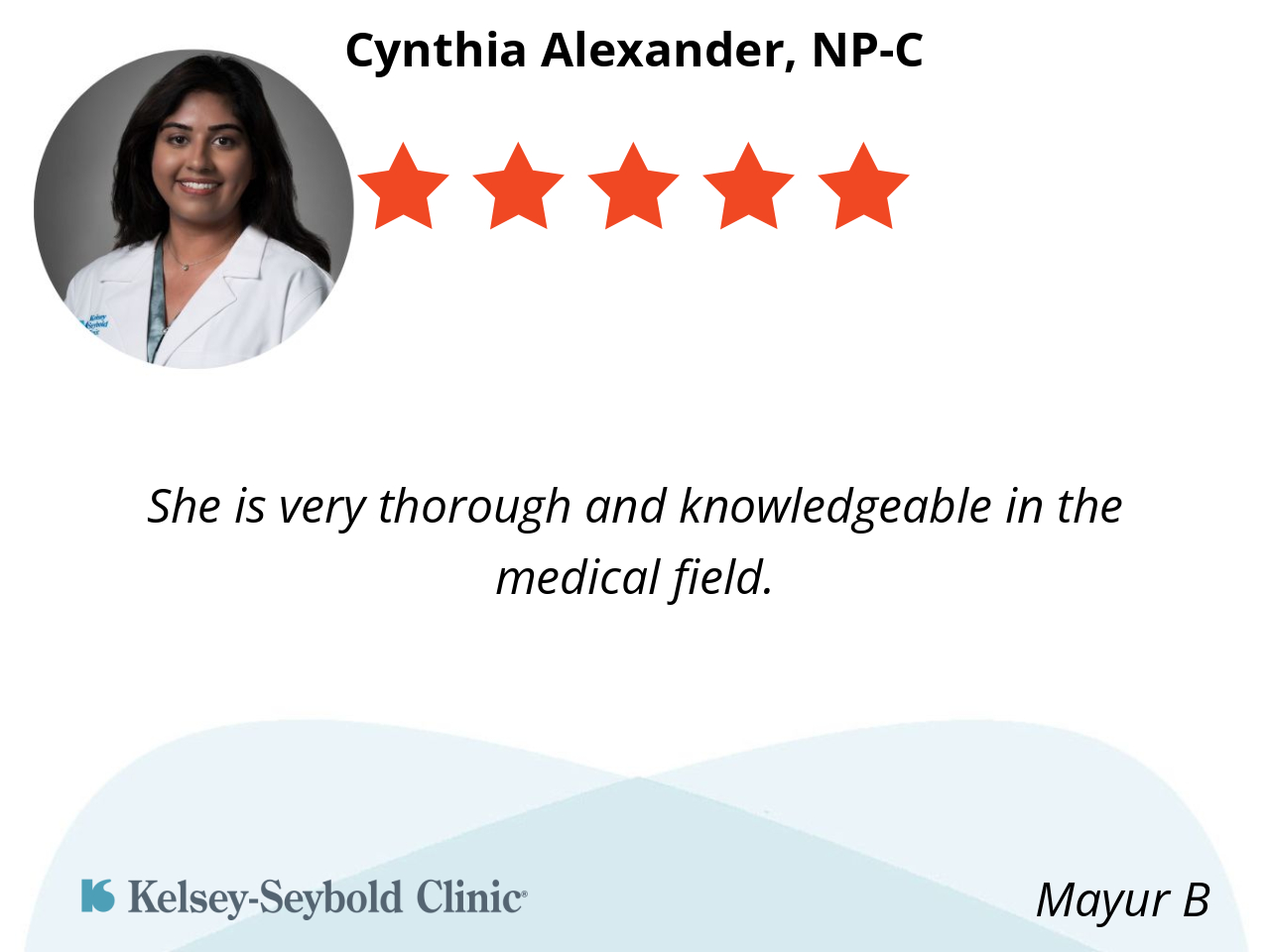 Cynthia is a great practitioner. She takes the time to listen and exhibits genuine care and professionalism. In fact, all the practitioners at the Lake Jackson Kelsey-Seybold Clinic deserve this praise. Cynthia, Holly and Dr. Prezas are three of the best practitioners I have seen in my adult life. I highly recommend this practice to everyone in the area. You won't find a more caring practice than this one.