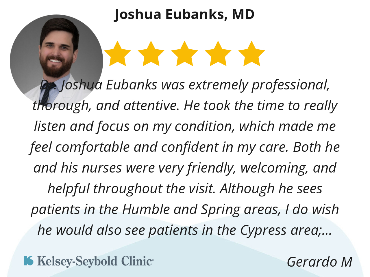 Dr. Joshua Eubanks was extremely professional, thorough, and attentive. He took the time to really listen and focus on my condition, which made me feel comfortable and confident in my care. Both he and his nurses were very friendly, welcoming, and helpful throughout the visit. Although he sees patients in the Humble and Spring areas, I do wish he would also see patients in the Cypress area; however, because of his great attentiveness and professionalism, I am more than willing to make the drive to see him. Overall, I truly appreciated the level of care and attention I received and would highly recommend Dr. Eubanks.