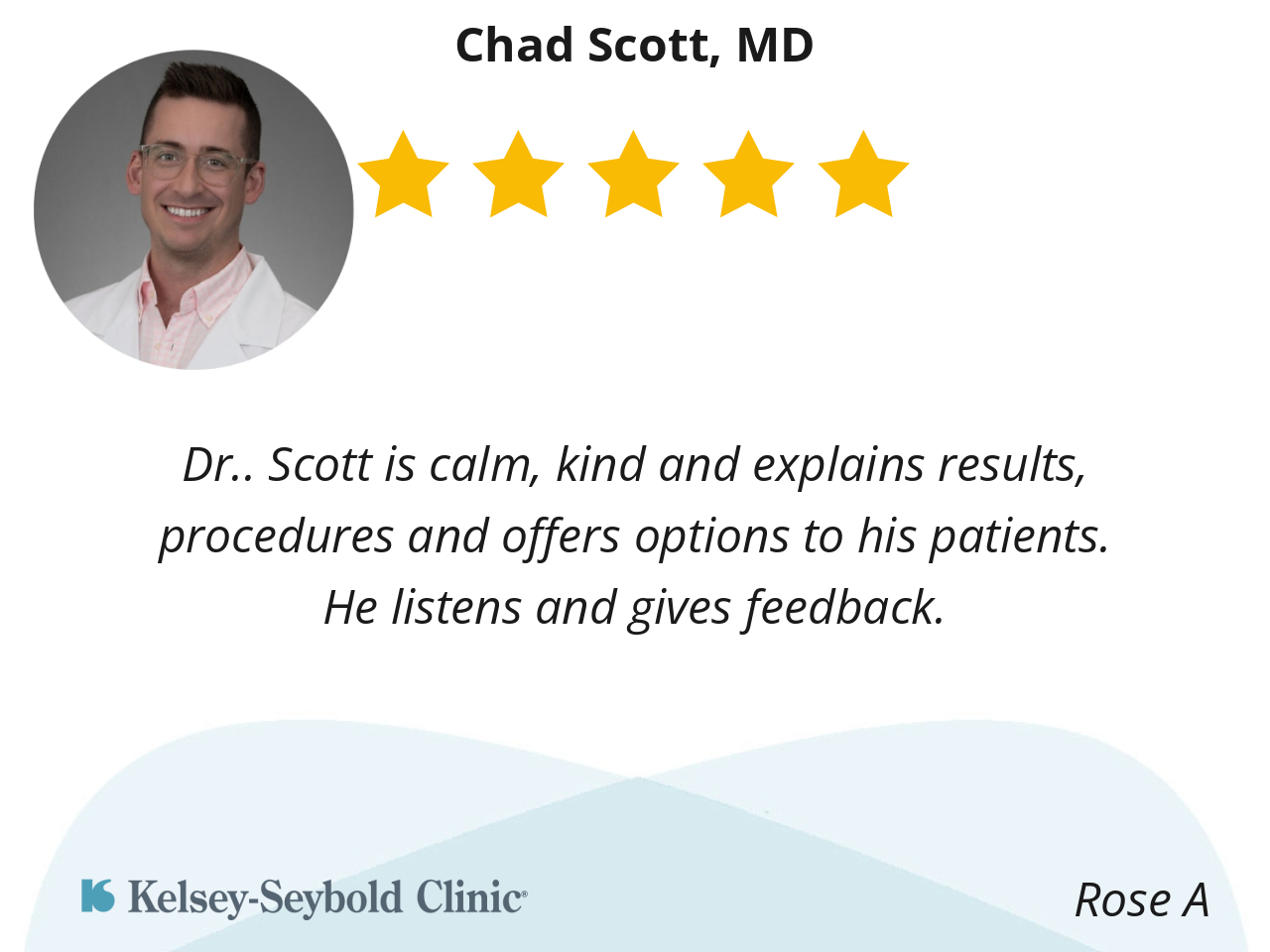 Dr.. Scott is calm, kind and explains results, procedures and offers options to his patients.