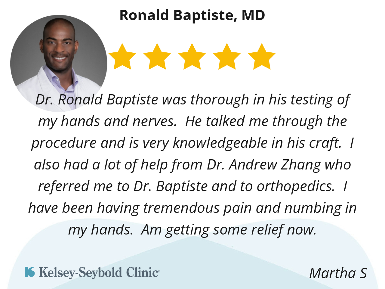 Dr. Ronald Baptiste was thorough in his testing of my hands and nerves. He talked me through the procedure and is very knowledgeable in his craft. I also had a lot of help from Dr. Andrew Zhang who referred me to Dr. Baptiste and to orthopedics. I have been having tremendous pain and numbing in my hands. Am getting some relief now.