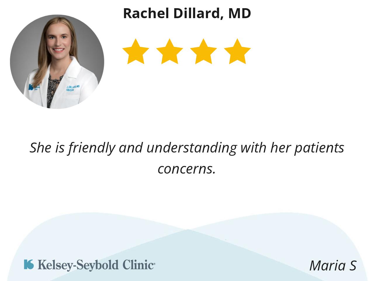 Dr. Rachel Dillard is an excellent doctor! She is very informative, taking the time to explain everything clearly. She is also understanding and truly listens to any concerns. On top of that, she’s incredibly nice and makes you feel comfortable during the visit. Highly recommend!