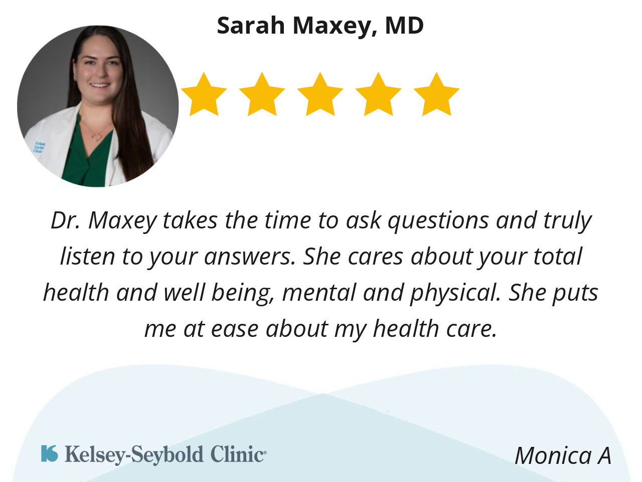 Dr. Maxey takes the time to ask questions and truly listen to your answers. She cares about your total health and well being, mental and physical. She puts me at ease about my health care.