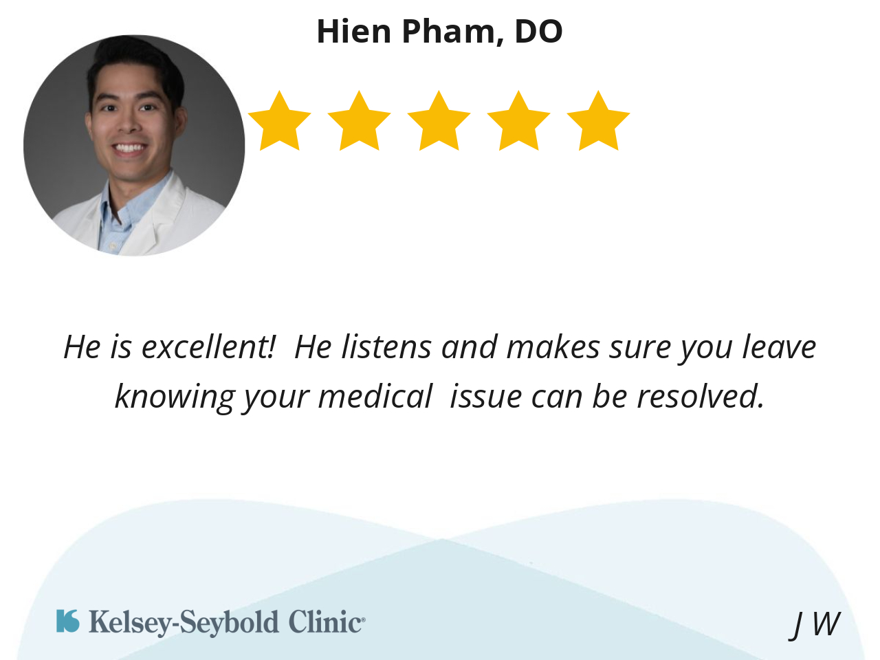 It was my first visit to Kelsey Seybold and it was a good one. Thank you, Dr. Pham.