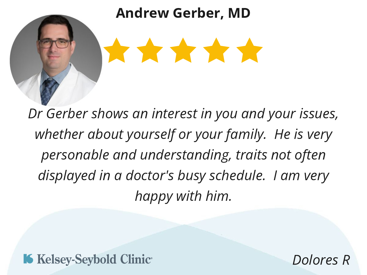 Dr Gerber shows an interest in you and your issues, whether about yourself or your family. He is very personable and understanding, traits not often displayed in a doctor's busy schedule. I am very happy with him.