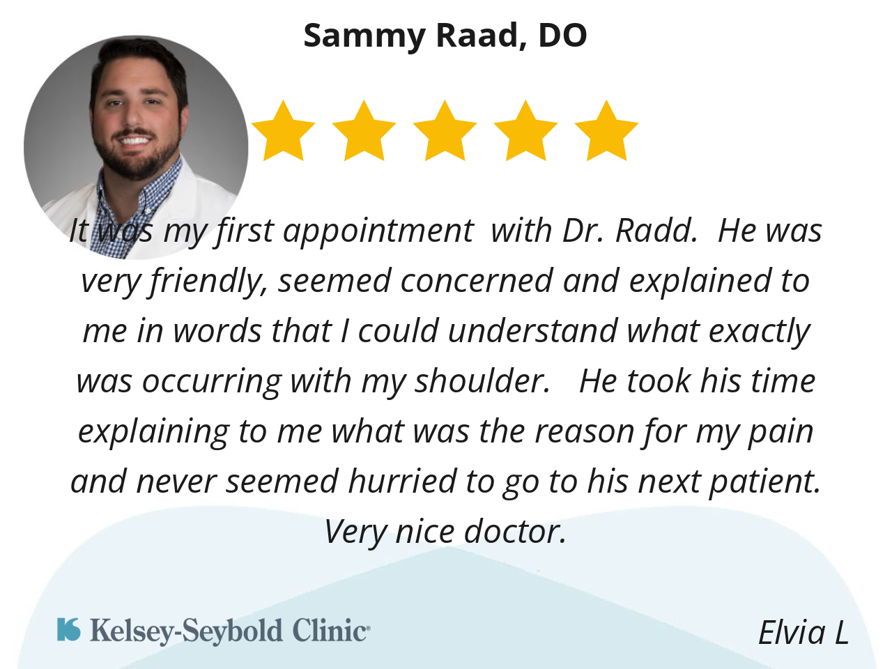 It was my first appointment with Dr. Radd. He was very friendly, seemed concerned and explained to me in words that I could understand what exactly was occurring with my shoulder. He took his time explaining to me what was the reason for my pain and never seemed hurried to go to his next patient. Very nice doctor.