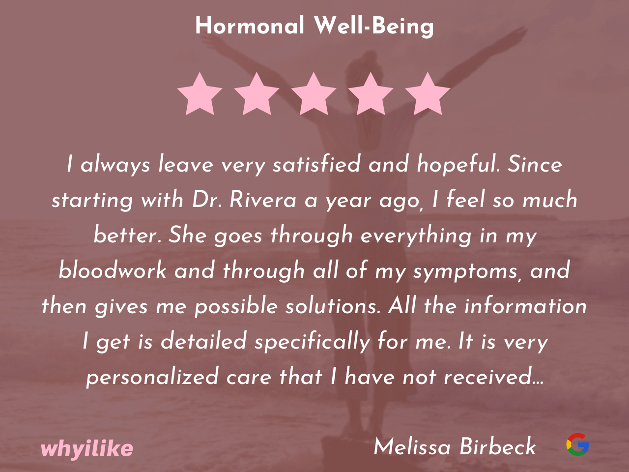 I always leave very satisfied and hopeful. Since starting with Dr. Rivera a year ago, I feel so much better. She goes through everything in my bloodwork and through all of my symptoms, and then gives me possible solutions. All the information I get is detailed specifically for me. It is very personalized care that I have not received anywhere else before.