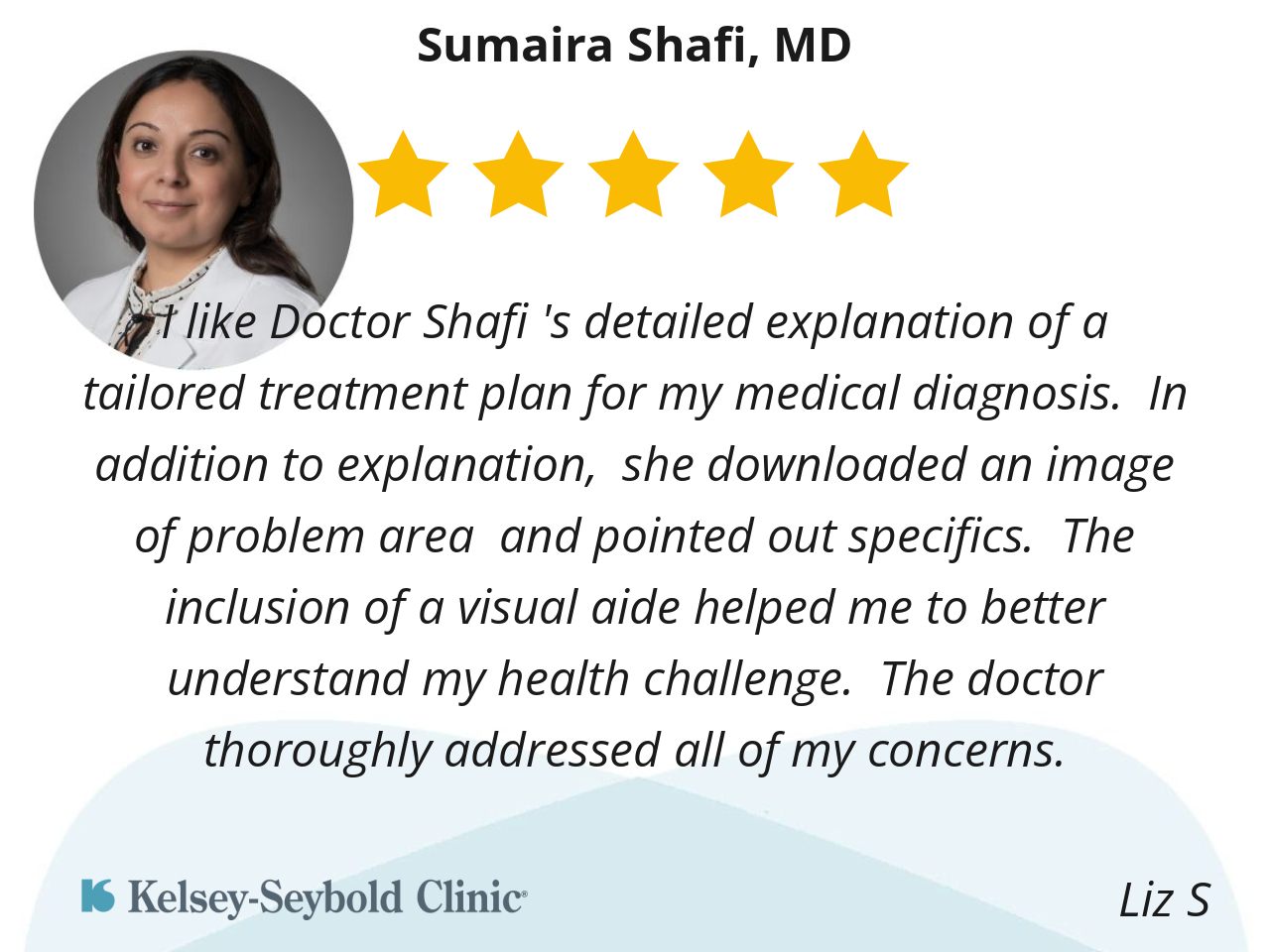 Overall, we feel Dr. Shafi is an outstanding physician and a real asset to Kelsey Sebold.