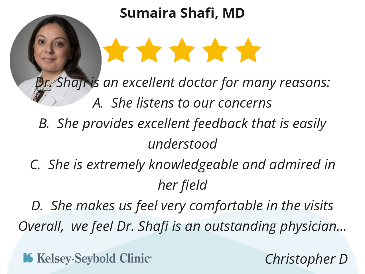 Overall, we feel Dr. Shafi is an outstanding physician and a real asset to Kelsey Sebold.