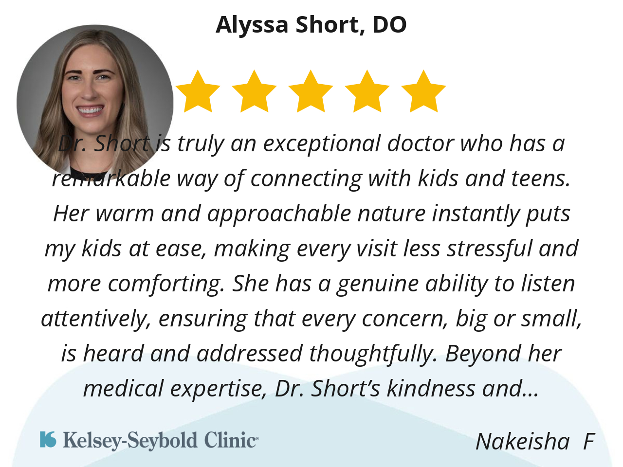 Dr. Short is truly an exceptional doctor who has a remarkable way of connecting with kids and teens. Her warm and approachable nature instantly puts my kids at ease, making every visit less stressful and more comforting. She has a genuine ability to listen attentively, ensuring that every concern, big or small, is heard and addressed thoughtfully. Beyond her medical expertise, Dr. Short’s kindness and dedication shine through in her patient care, always going the extra mile to be helpful and supportive. Thank you Dr. Short.