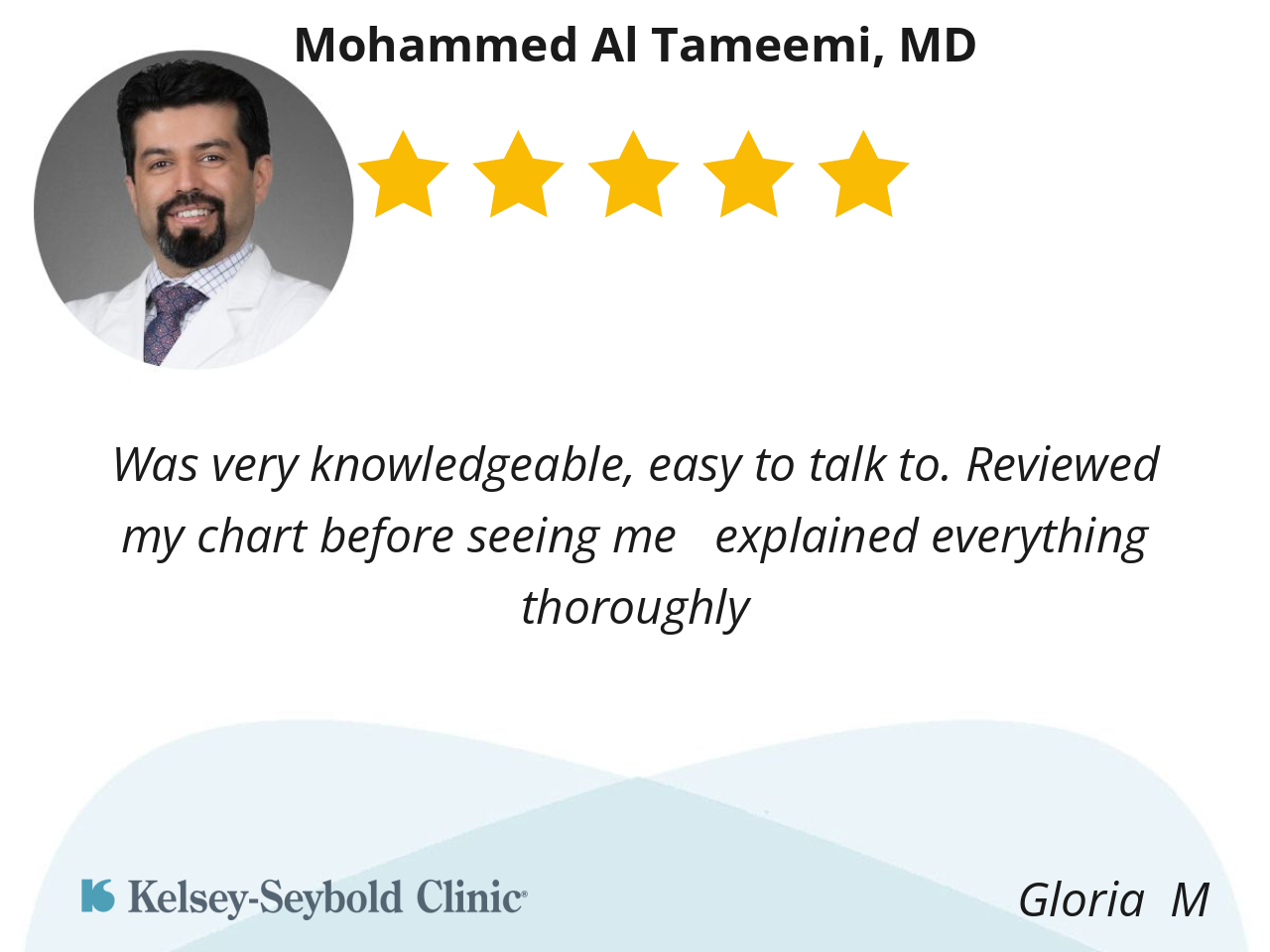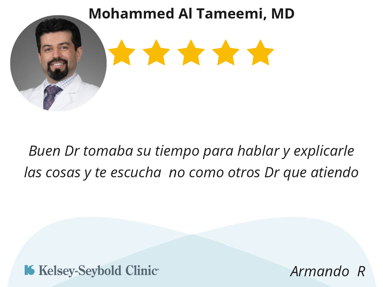 Dr. Mohammed Al Tammeemi takes the time to explain fully and makes sure I understand all of my meds and diabetes. I leave his office fully understanding. I'm very happy to have him as my Endocrinologist.