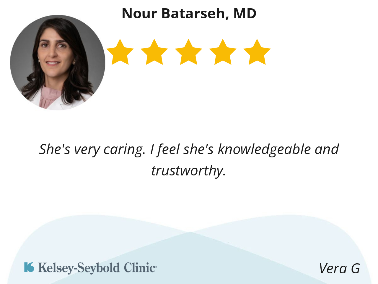 Because she’s not just a doctor, she genuinely cares. I appreciate Dr. Nour’s professionalism, her depth of knowledge, and the confidence she brings to every situation. She is consistent, reliable, and always focused on what’s best for her patients.