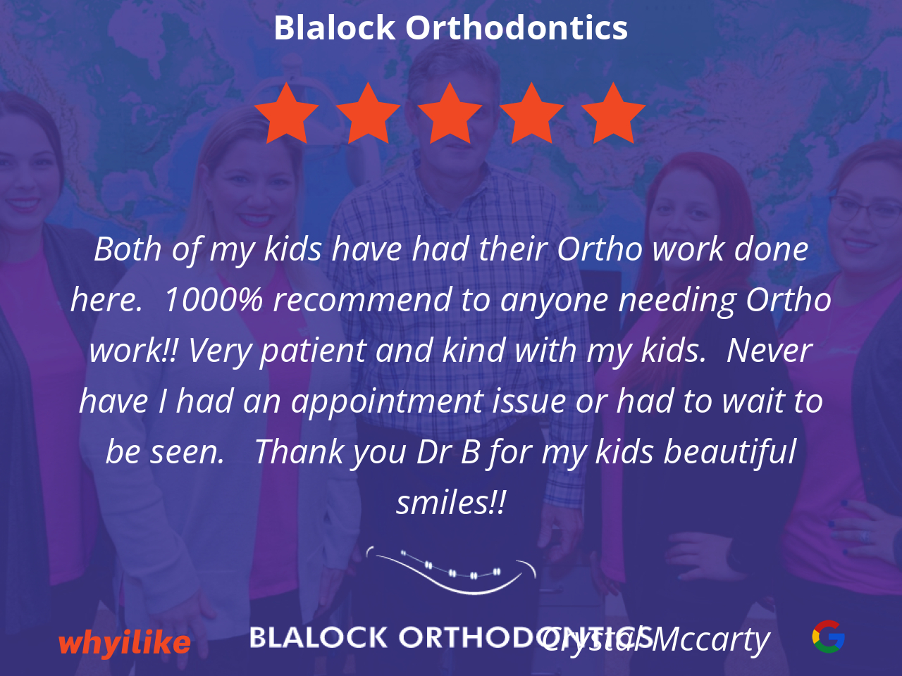 All 3 of my children had their braces done by Dr. Blalock and I couldn’t be happier! Every step was explained and all 3 outcomes were outstanding! All the ladies in the office from the front desk to the orthodontic assistants are helpful and friendly. It’s bittersweet that my last child is done because we’ve grown to know them for so many years. Highly recommend!
