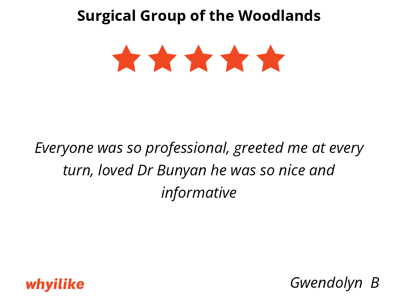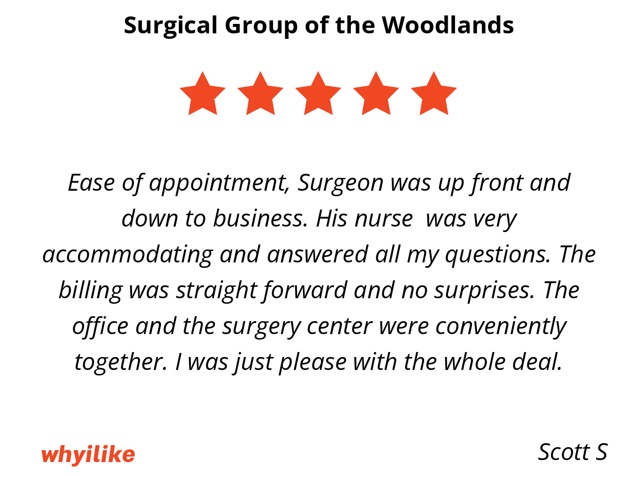 Surgical Group of The Woodlands is committed to providing comprehensive surgical care based upon the latest technological advancements with attention to, and compassion for, the needs of our patients and our community. All of the surgeons are board certified or board eligible in general surgery under the American Board of Surgery and are all members of the American College of Surgeons.