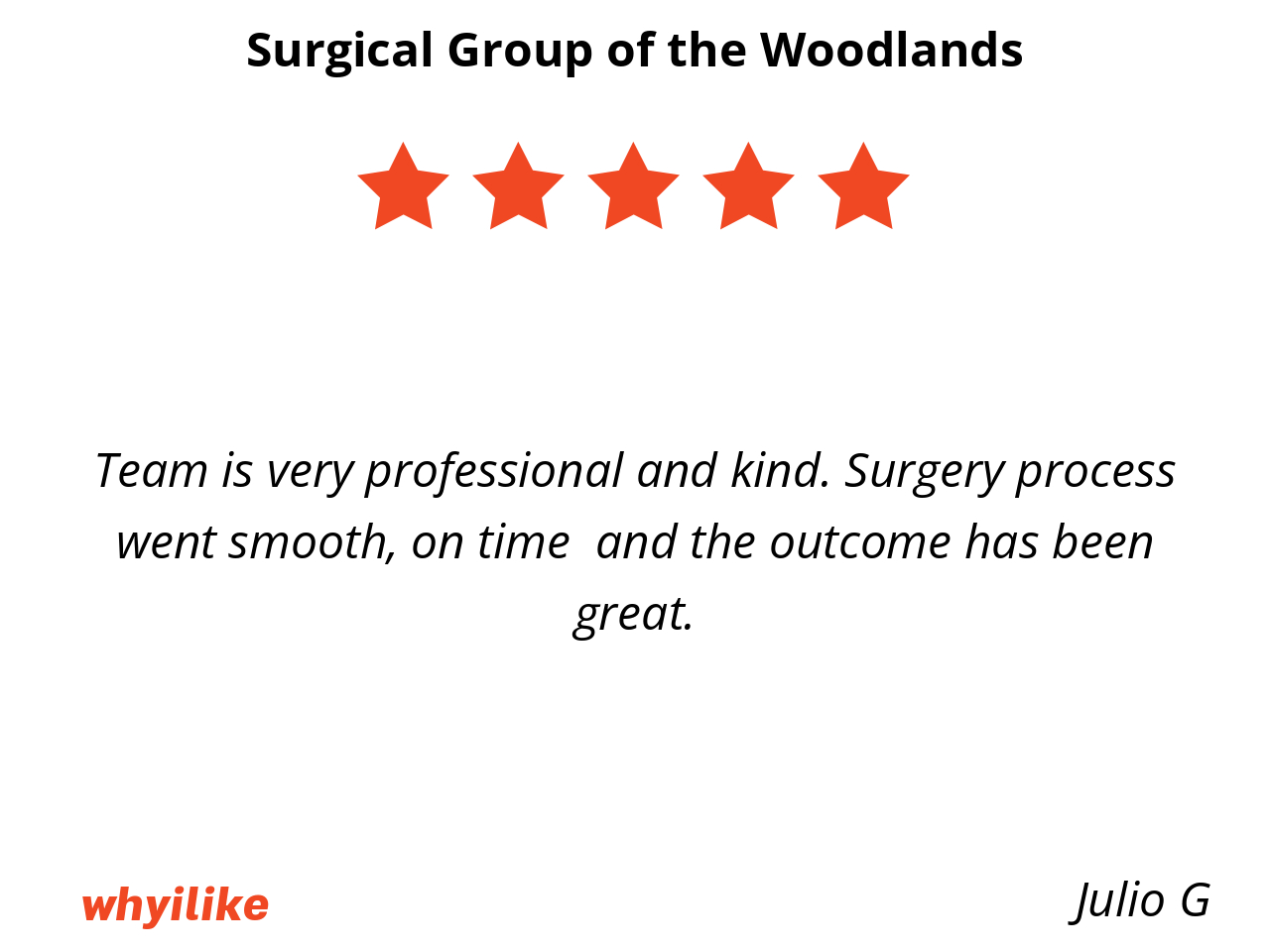 Surgical Group of The Woodlands were excellent when I had surgery. They were so kind and informative. I especially appreciated their prayers for the success of my surgery. The surgery could not have been more successful than it was.