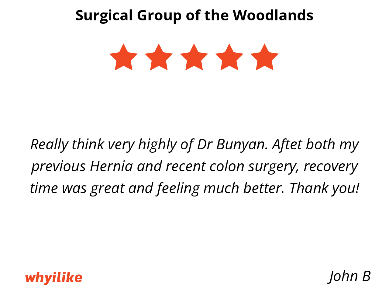 I am so happy with the care I received from Dr. Bunyan, with the Surgical Group of the Woodlands , he was kind and caring and helped me promptly to resolve the issue I had faced. I would not hesitate to return to his care in the future if needed.