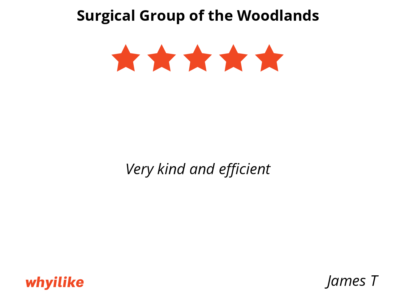 Surgical Group of The Woodlands were excellent when I had surgery. They were so kind and informative. I especially appreciated their prayers for the success of my surgery. The surgery could not have been more successful than it was.
