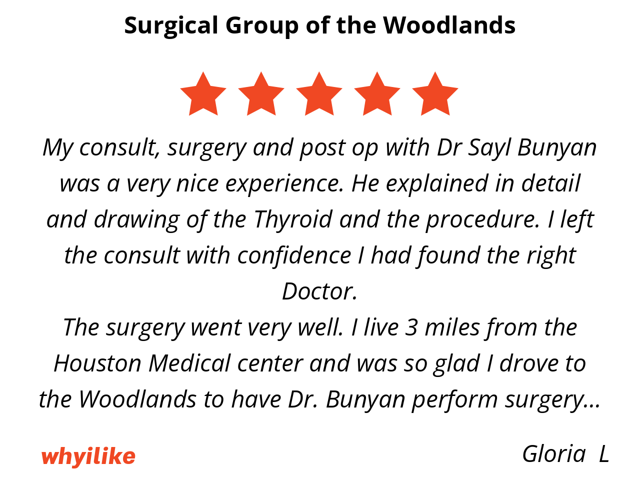 My consult, surgery and post op with Dr Sayl Bunyan was a very nice experience. He explained in detail and drawing of the Thyroid and the procedure. I left the consult with confidence I had found the right Doctor.