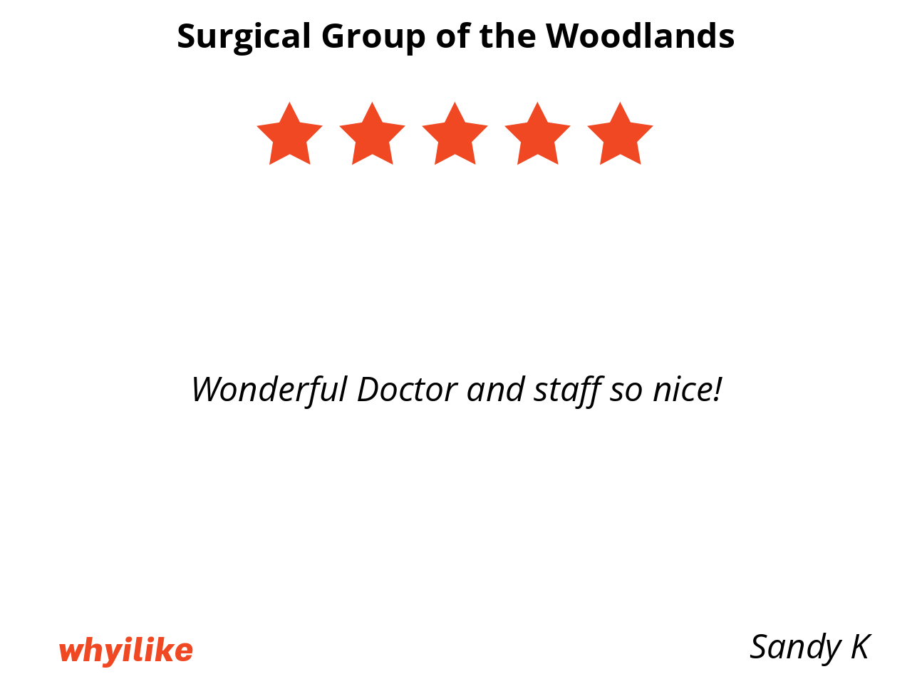 Surgical Group of The Woodlands were excellent when I had surgery. They were so kind and informative. I especially appreciated their prayers for the success of my surgery. The surgery could not have been more successful than it was.