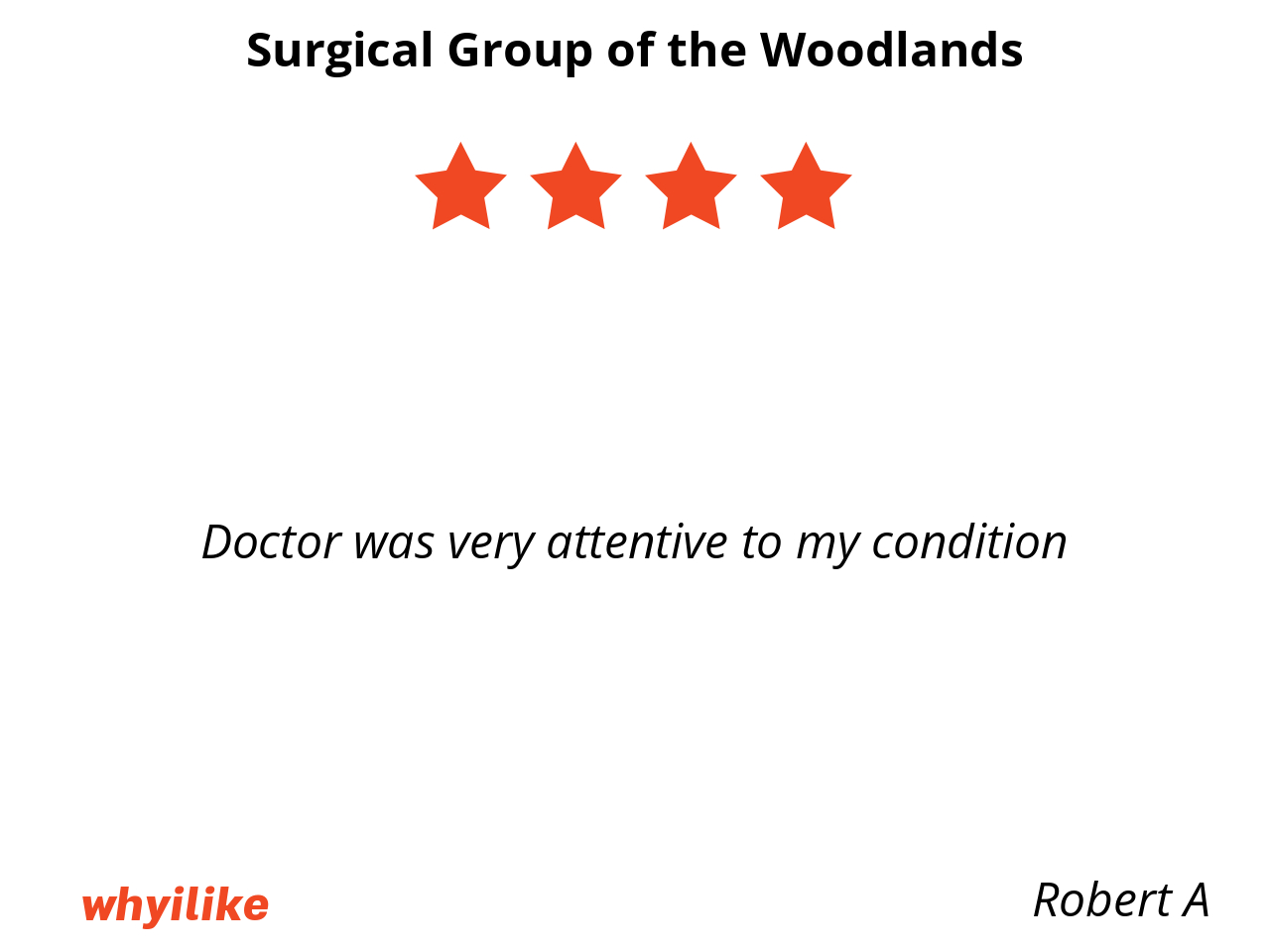 Surgical Group of The Woodlands were excellent when I had surgery. They were so kind and informative. I especially appreciated their prayers for the success of my surgery. The surgery could not have been more successful than it was.