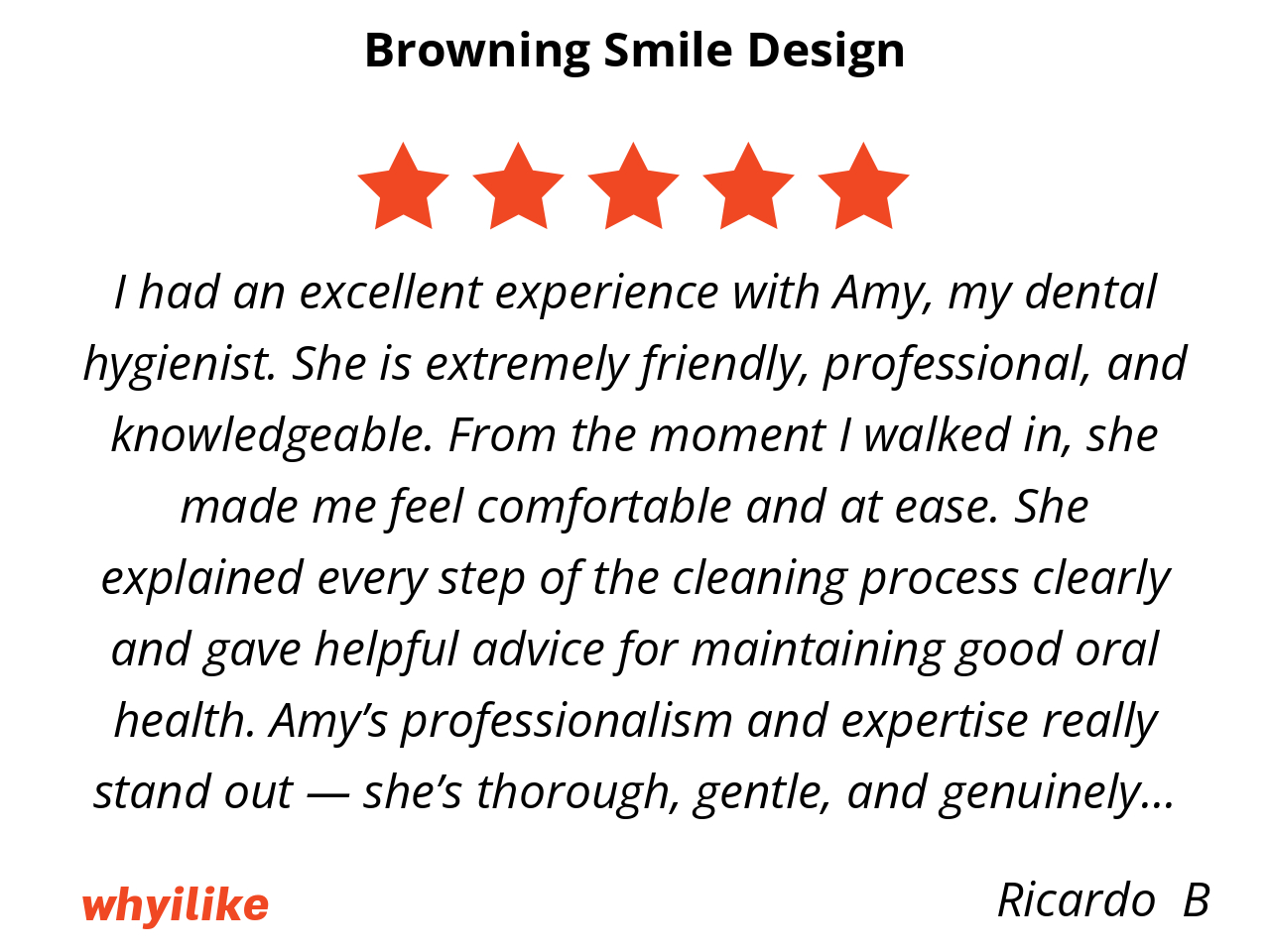 I had an excellent experience with Amy, my dental hygienist. She is extremely friendly, professional, and knowledgeable. From the moment I walked in, she made me feel comfortable and at ease. She explained every step of the cleaning process clearly and gave helpful advice for maintaining good oral health. Amy’s professionalism and expertise really stand out — she’s thorough, gentle, and genuinely cares about her patients. I highly recommend her to anyone looking for a top-notch dental hygienist!