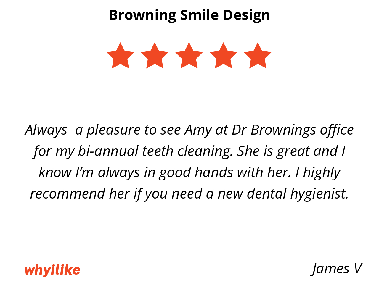 Always a pleasure to see Amy at Dr Brownings office for my bi-annual teeth cleaning. She is great and I know I’m always in good hands with her. I highly recommend her if you need a new dental hygienist.
