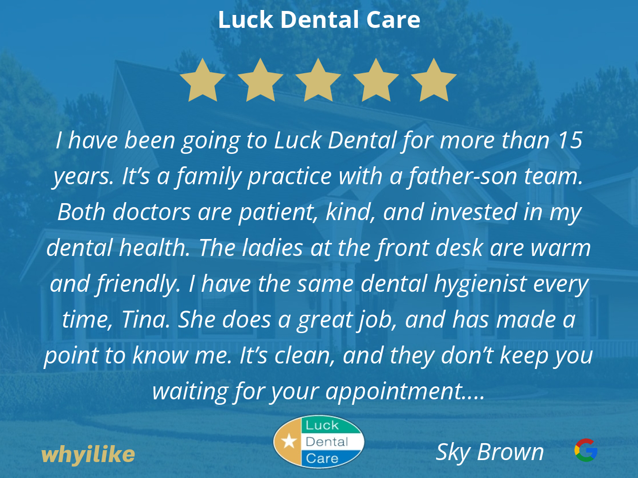 We have been patients at Luck Dental Care for almost 20 years and have always had such a wonderful experience! The entire staff is so welcoming and caring, and they really take the time to get to know you! Can’t recommend them enough!