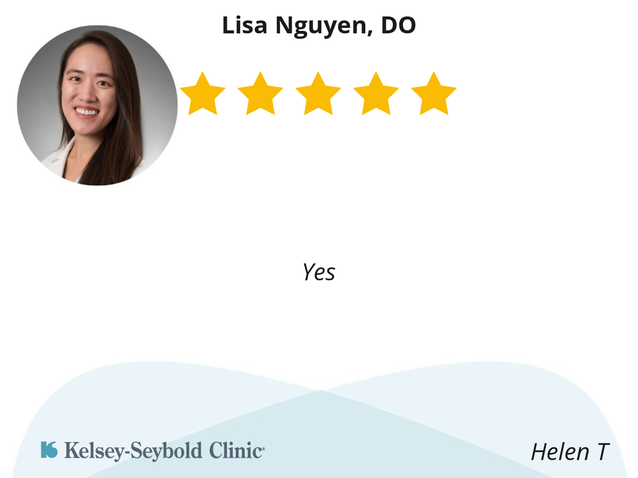 I gave Dr. Lisa Nguyen a five stars rating from my doctor's visit. If I could give her ten stars I would. From the time she walked into the room, she had the biggest smile. She is the sweetest and most kind doctor, I've ever met. She listened to everything I said. She explained everything to me during my doctor's visit. I left there feeling good about my visit because of her, although I was not feeling well. I would recommend Dr. Lisa Nguyen to anyone that is looking for a great doctor!!