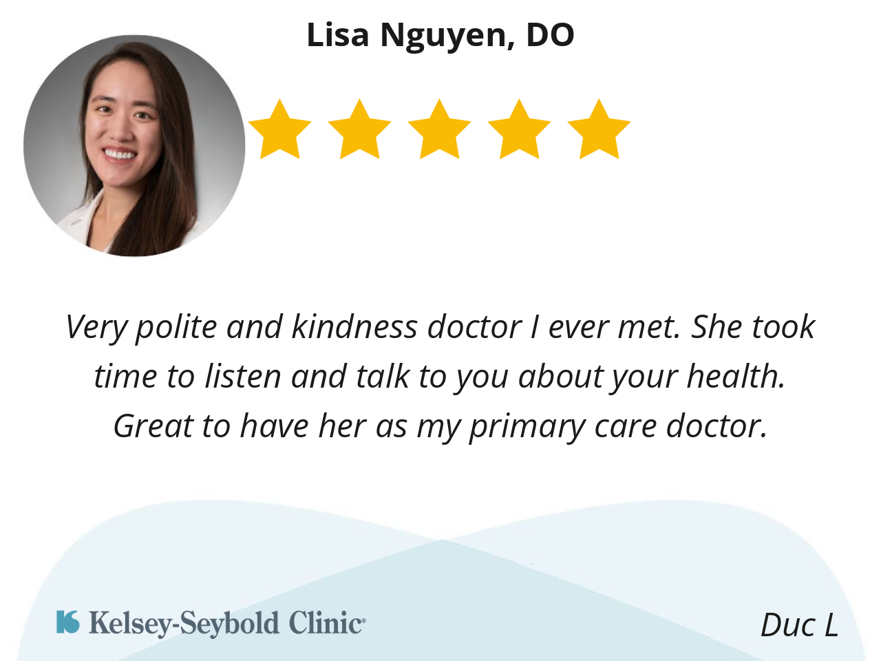 I wholeheartedly recommend Dr. Lisa Nguyen to anyone seeking a dedicated and caring physician. Thank you, Dr. Lisa Nguyen, for being not just my doctor, but a true partner in my health journey!