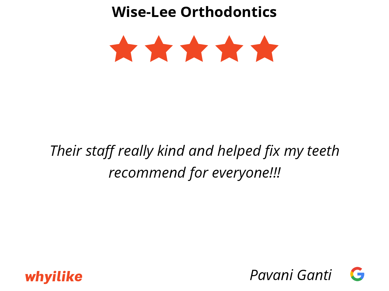 Great experience with Doctors - Wise and Lee. The staff was friendly, appointments were always on time, and the treatment was clearly explained at every step. My son’s teeth look amazing now, and I couldn’t be happier with the results. Highly recommended for anyone considering orthodontic care!