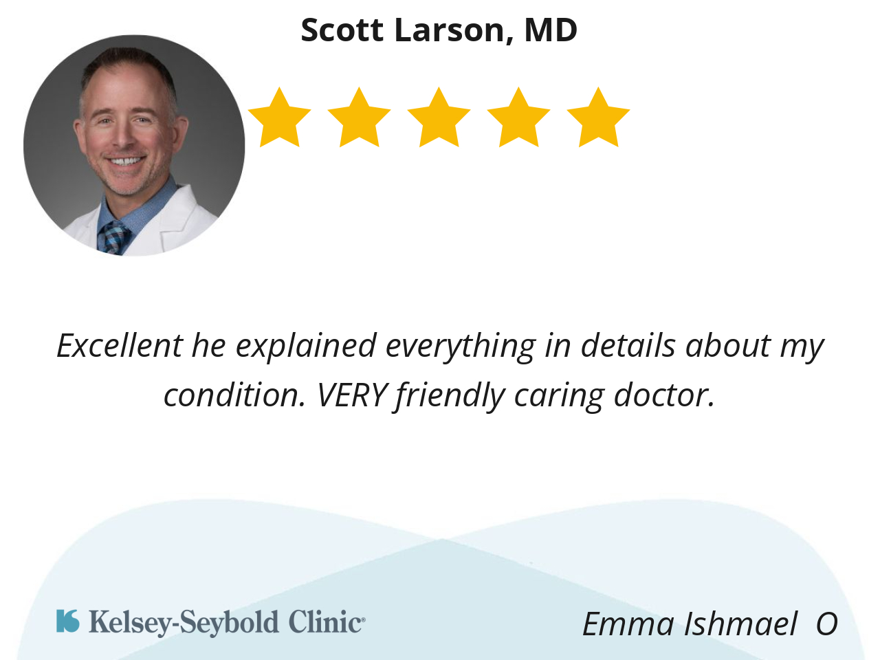 Dr Larson is a very knowledgeable medical professional who listens to your concerns and allows you to describe your symptoms as he reviews your medical history. He gives you his full attention and explains in laymen’s terms what maybe a medical condition to treat. He doesn’t rush you through an exam and he allows for all questions you may have. He gives you his full attention and I feel we are in a partnership together to treat my medical condition and/or challenges. I am sooo grateful to have him for my doctor.
