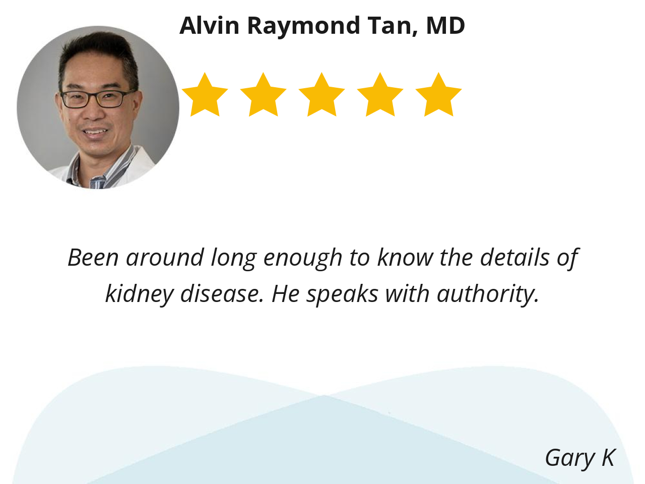 This was my first visit with Dr Tan. He explained the difference between kidney disease and kidney failure. He also answered all of my questions and concerns with great clarity. I appreciate his teaching.