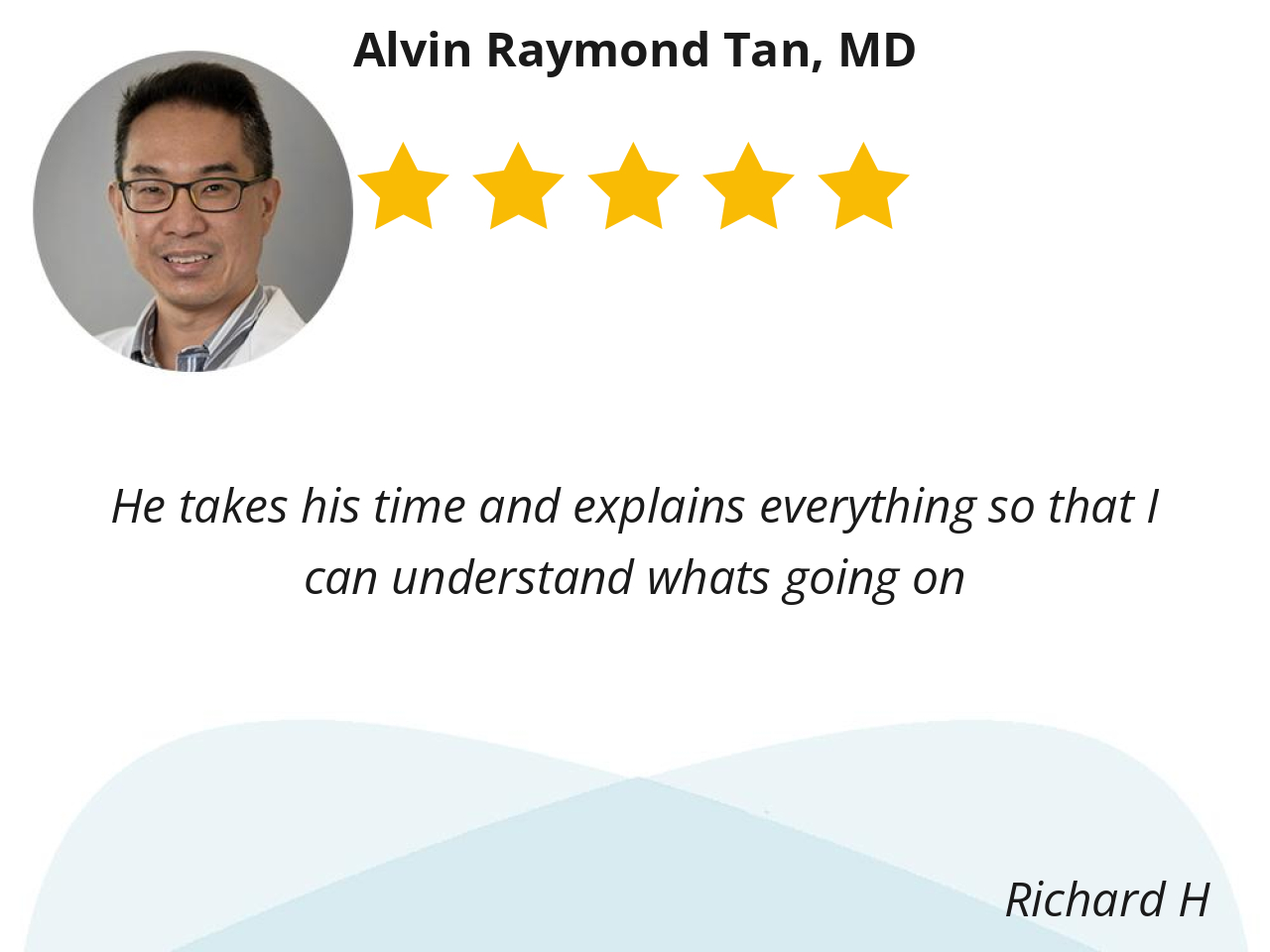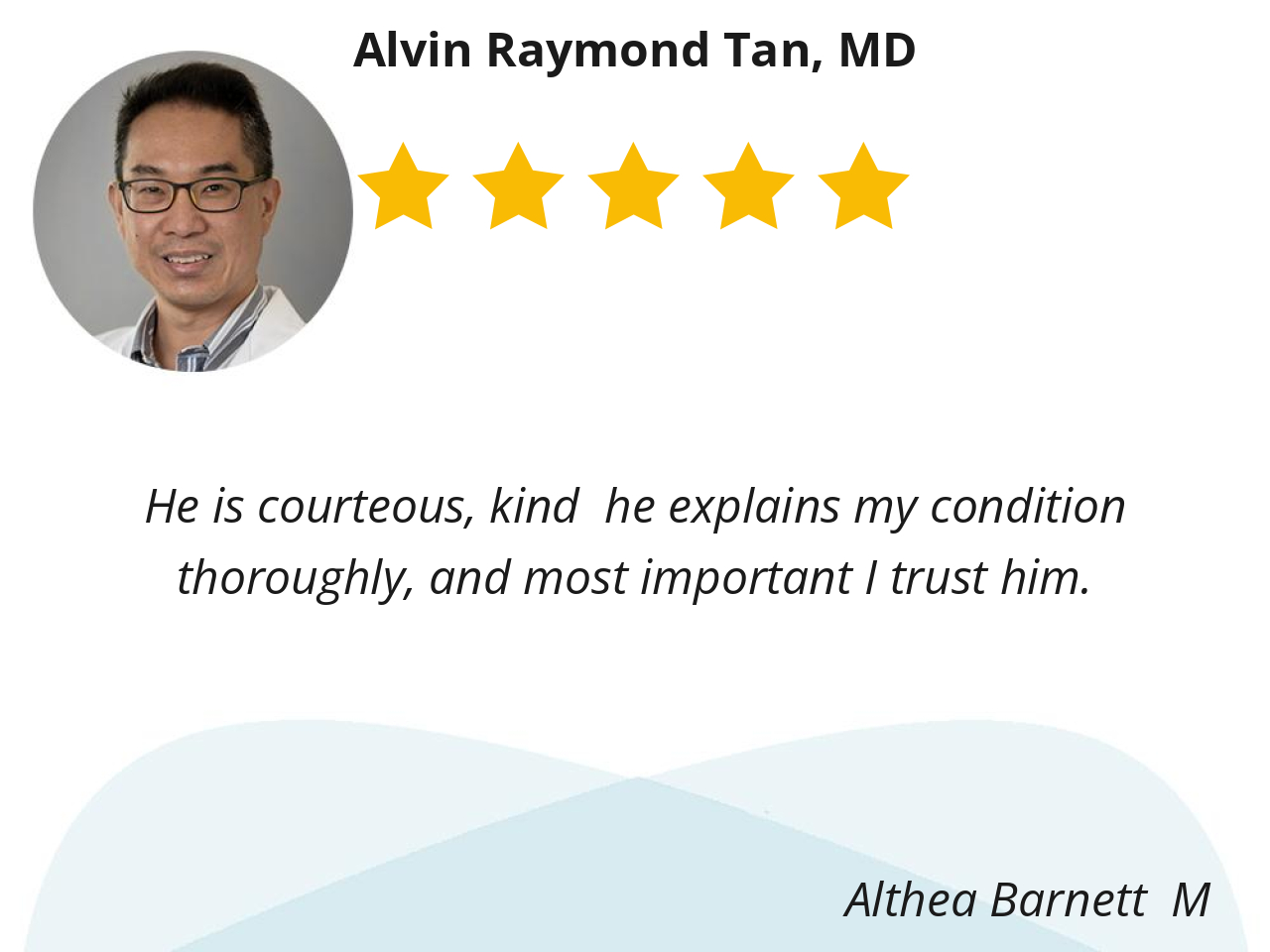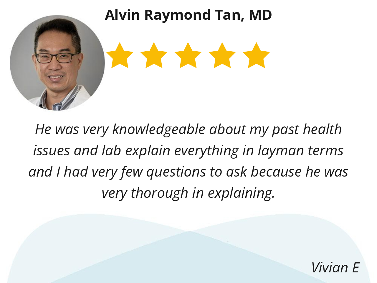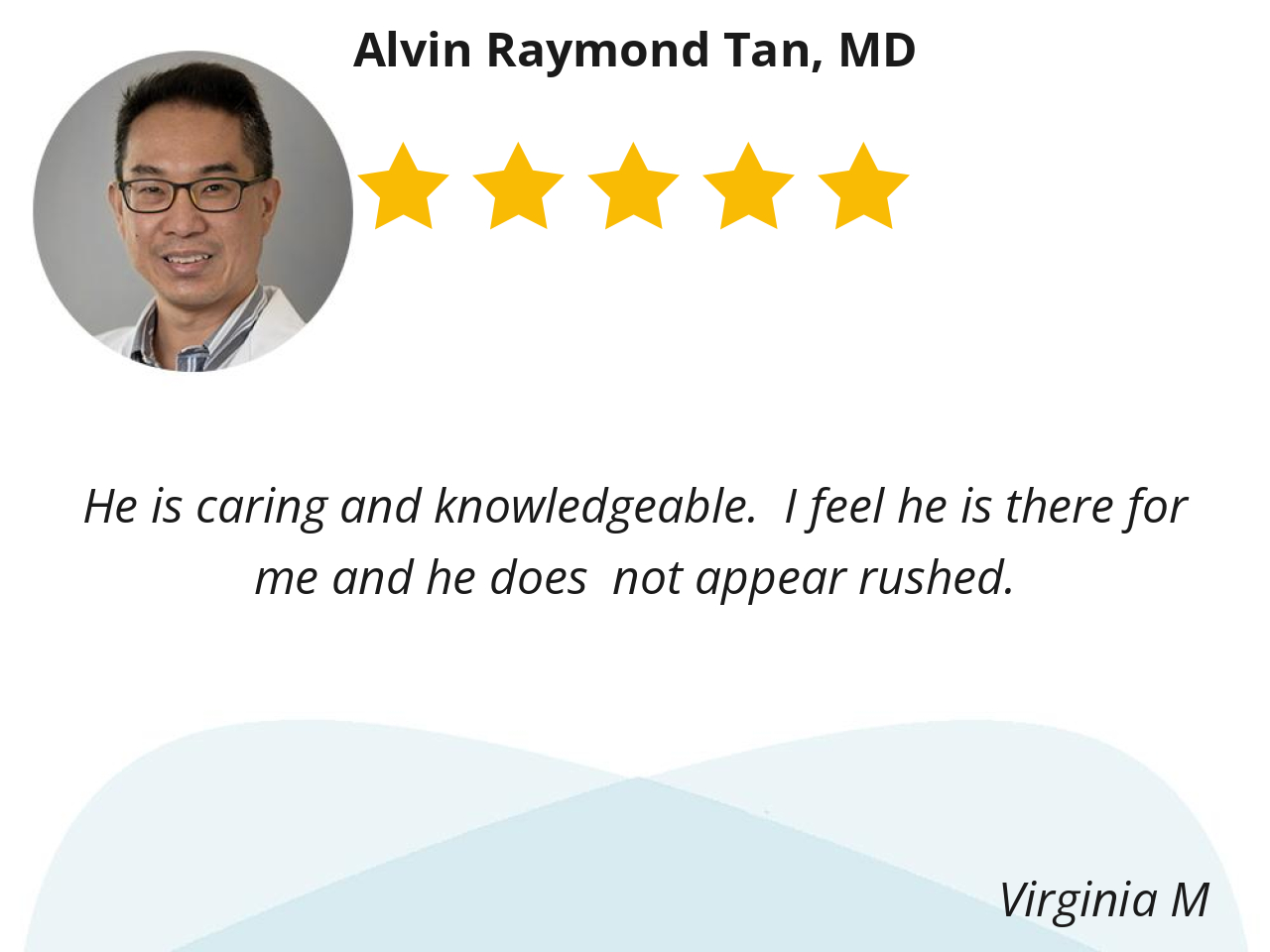 Dr. Tan is consistently professional, pleasant, and informative. Our conversations always contribute to my sense of security. I sincerely appreciate his reliable attention concerning my condition!!!