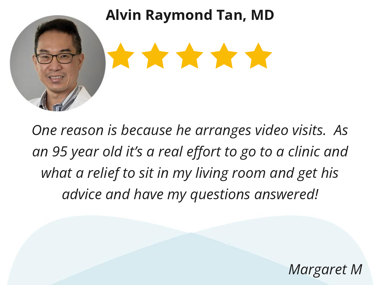 One reason is because he arranges video visits. As an 95 year old it’s a real effort to go to a clinic and what a relief to sit in my living room and get his advice and have my questions answered!